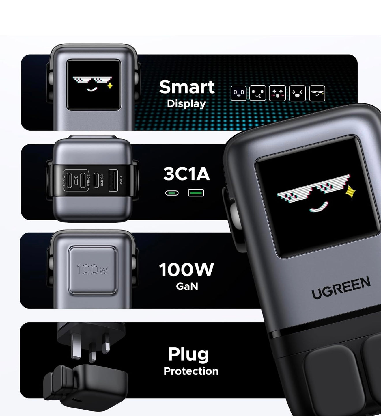 UGREEN UNO 100W USB C Charger 4-Port Nexode 100W GaN,LED Display,Compact Funny Fast Charger Type C Power